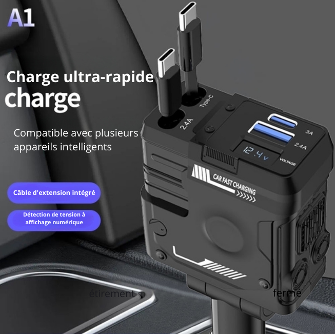 Le Chargeur de voiture super rapide multiports recharge tous vos appareils rapidement et simultanément, même pendant les trajets courts.